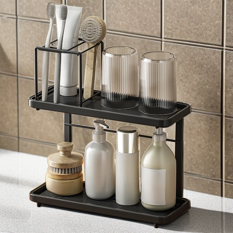 ● Maximize your bathroom space with this multifunctional double-layer storage rack, perfect for organizing toothbrushes, shampoo, and shower gel all in one place.